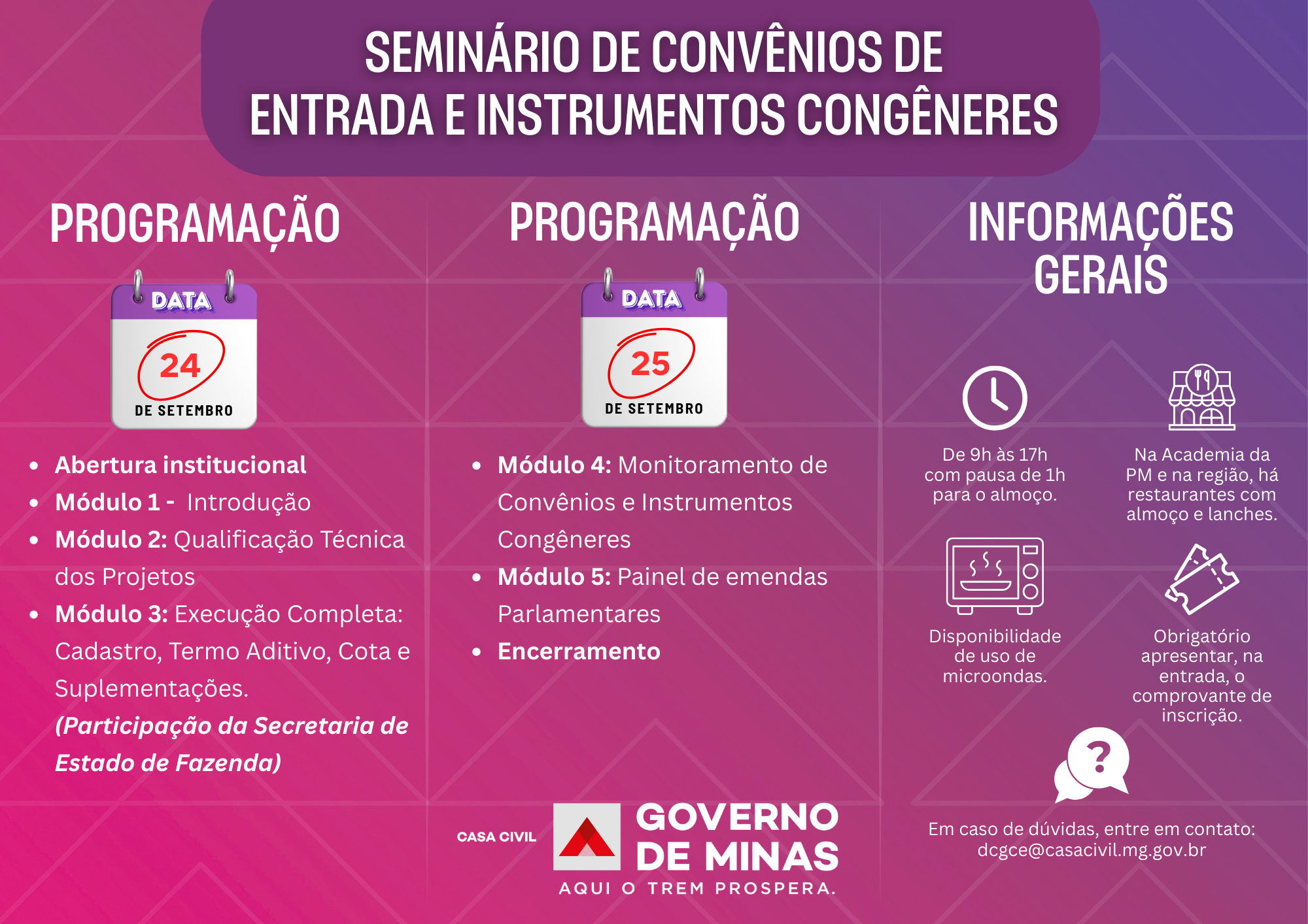 As inscrições para o Seminário de Convênios de Entrada e Instrumentos Congêneres já estão abertas! O evento será realizado nos dias 24 e 25 de setembro, na Academia da PMMG, em Belo Horizonte, e reunirá gestores e técnicos que atuam com transferências voluntárias da União, emendas parlamentares, convênios e instrumentos similares.